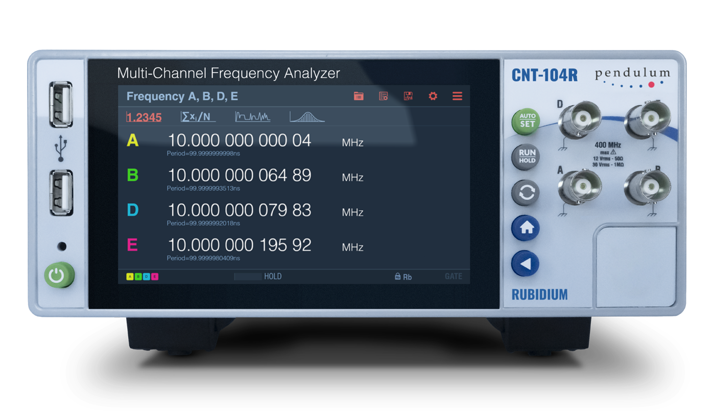 The Pendulum CNT-104R is a new concept for super-performance multi-channel frequency and time-interval calibration and analysis, in a bench-top unit. It is a one-box Frequency and Time Interval calibrator combining an ultra-stable 10 MHz Rubidium Frequency Reference with a 4-channel advanced Frequency Analyzer. You can calibrate up to 4 oscillators/clocks in parallel simultaneously on 4 input channels.